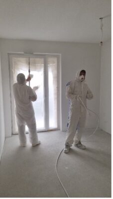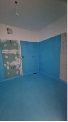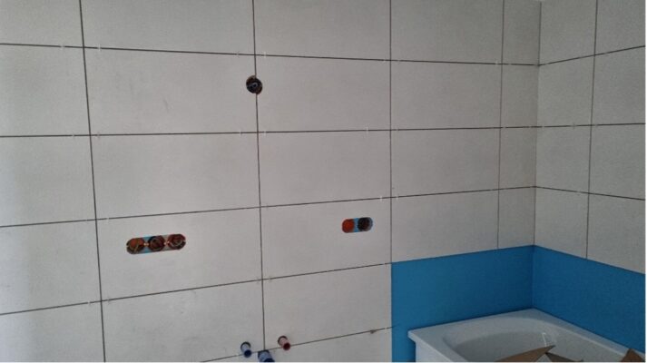 Nach und nach werden immer mehr Gewerke fertiggestellt. Hand in Hand mit dem Abschluss der Malerarbeiten hat der Fliesenleger seine Arbeiten begonnen. Gleichzeitig wurde auch mit der Komplettierung der Sanitärinstallation und Elektroinstallation gestartet.